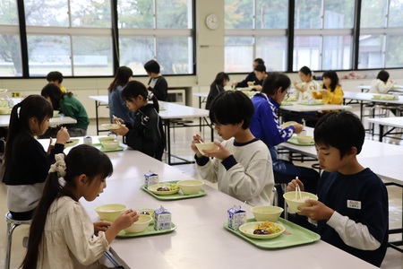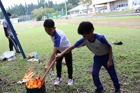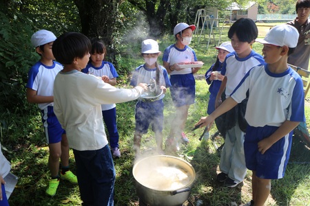 10月2日のマラソン記録会終了後に、芋煮会を行いました。里芋を植えた3、4年生の、「みんなで芋煮会をしよう」という思いから立ち上がった大きな企画で、学校での芋煮会は、新型コロナ感染症で中止して以来の復活です。縦割り班の高学年が火おこしや調理をリードし、試行錯誤しながらも楽しく芋煮を作りました。澄み渡った青空のもと、マラソン後の空腹を熱々の芋煮で満たし、幸せなひと時となりました。