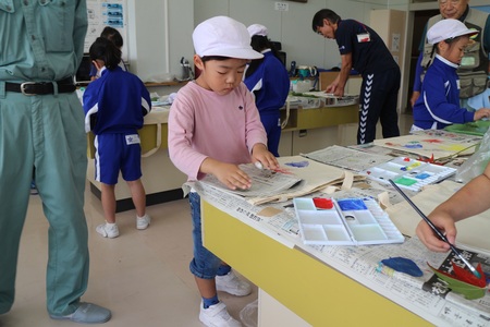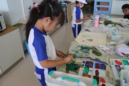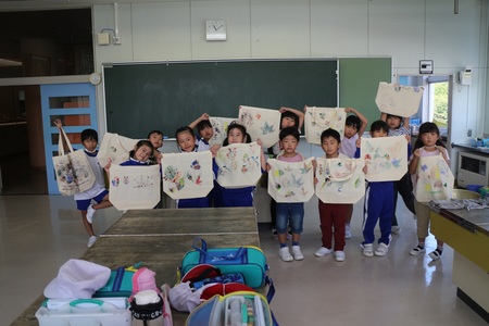 10月3日(金曜)に低学年の森林学習を行いました。今回は、葉っぱを使ったオリジナルマイバッグ作り。まず、学校の周りから好きな葉っぱを見つけてきました。それにアクリル絵の具をつけて、バッグの生地にペタペタ型押しをしました。葉っぱの形や筋が浮かび上がって、とってもすてきなバッグになりました。