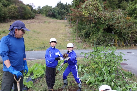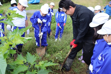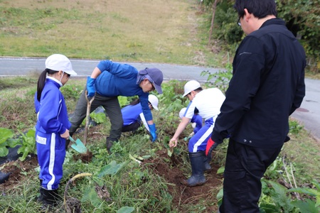 10月29日(水曜)に、3、4年生が夏に学校の畑に植えた里芋を、JAみちのく村山葉山支店海老名さんと一緒に掘りました。猛暑や少雨の影響で、思うような収穫とはいきませんでしたが、親芋や孫芋のついたものもありました。掘った里芋は、11月1日の産業フェアで展示します。どうぞご覧ください。