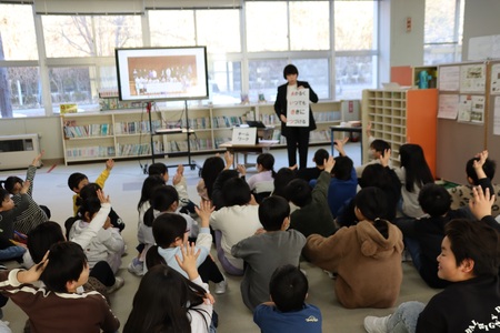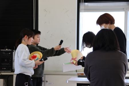 12月2日(火曜)に、健康委員会の子どもたちが主催した給食感謝の会が行われました。全校生が書いたお手紙や手作りの花束をプレゼントし、お二人の調理師さんからお話をしていただきました。毎日おいしい給食を作ってくださる秋生調理師さん、高橋調理師さん、本当にありがとうございます。これからもよろしくお願いします