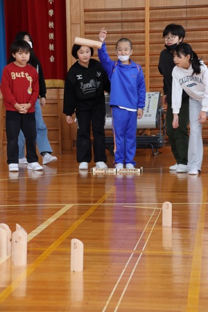 12月12日(金曜)に、特別支援学校の友達と本校高学年児童とで交流会が行われました。冨本小の体育館でモルックをして楽しみました。モルックは、フィンランド発祥の競技で、「モルック」という木の棒で「スキットル」と呼ばれる数字の書いてある12本のピンを倒して得点を競うものです。グループに分かれて、作戦を練りながらみんなで仲良く楽しく遊びました。