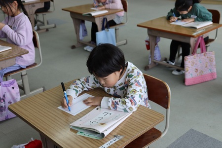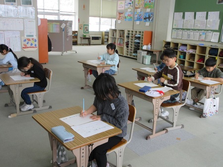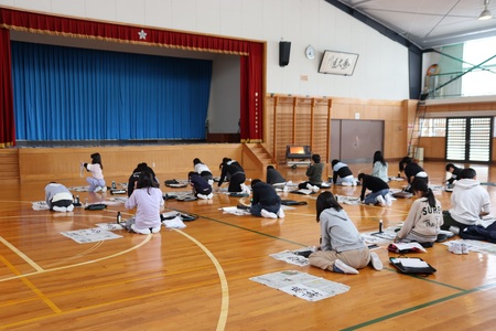 1月9日(金曜)に、校内書初め会が行われました。低学年は、教室で、課題を鉛筆やフェルトペンで丁寧に書きました。中高学年は、体育館に集まり、課題を毛筆で書きました。課題は、どの学年も年始にふさわしい言葉や、今年度の書写学習のまとめになるような言葉で、各会場は、緊張感に包まれました。厳かに「春の海」が響きわたる中、一人一人会心の出来の作品が完成しました。1階ホールに展示してありますので、ぜひご覧ください。