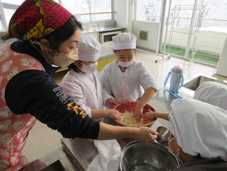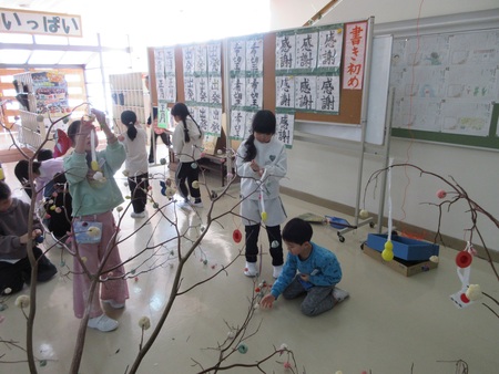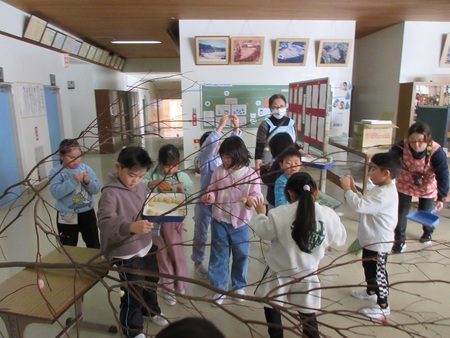 1月15日(木曜)に、低学年が、だんごさし体験をしました。だんごさしは、無病息災や家内安全などを願って、水木に色とりどりのだんごをさしたり、飾りをつるしたりする小正月行事です。担任の先生からだんごの作り方を聞いて、子どもたちは、丁寧に丸めたり木の枝にさしたりしました。出来上がっただんご木は、冨本小の玄関を華やかに彩っています。