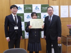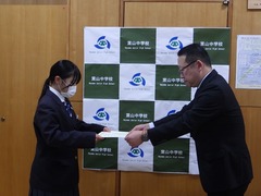 令和7年度中学生の「税についての作文」コンクールで、3年高橋舞有さんが「誰かの支えになる税金」の題名で、山形県納税推進協議会会長賞をいただきました。おめでとうございます。学校での授賞式での様子です。