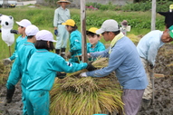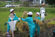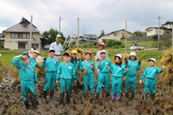 10月1日(水曜)、5年生で稲刈りを行いました。前日の雨のため足元がぬかるんで、長い時間かかりましたが、子どもたちは最後まで一生懸命に活動できました。作業は地区内の三原さんからお手伝いいただき、最後に杭掛けも体験しました。三原さんからは、田起こしや田植え、脱穀、そして毎日の管理など1年間お世話をしていただきました。