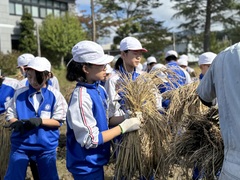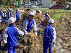 9月26日(金曜日)に、5年生が総合的な学習の時間で「稲刈り体験」を行いました。当日は、さわやかな秋晴れでしたが、前日に降った雨の影響で、田んぼはぬかるんだ状態でした。泥だらけになりながらも、子供たちは、稲刈り鎌を使って丁寧に稲を刈ることができました。また、村山産業高校の生徒も一緒に参加し、交流を深めました。