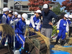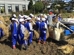 10月16日(金曜日)に、5年生が総合的な学習の時間で「脱穀体験」を行いました。50年以上前に主流だった足踏み式脱穀機を体験したり、ハーベスター(自動脱穀機)に稲を運ぶ活動をしたりして、刈り取った稲の穂先から、もみを分離する作業を味わいました。子供たちは、「おいしい米ができたかな。」と期待に胸を膨らませていました。