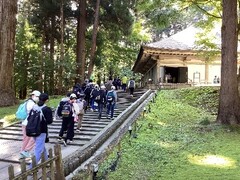 10月23日(木曜日)午前中、旅の始まりは世界遺産である中尊寺の拝観です。子供たちは、輝く金色堂の荘厳な美しさに圧倒されながら、当時の歴史や文化財の重要性を学びました。ガイドの方の解説に真剣に耳を傾け、熱心にメモを取る姿からは、「歴史を深く知りたい」という強い知的好奇心を感じました。