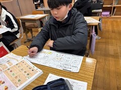 11月25日(火曜日)に1月の校内書初め会に向け、練習を行いました。今回は、村山書道会より専門の先生方を招きご指導いただきました。「漢字の作りや意味の知識をもとにした字のバランス」というプロのアドバイスで、児童はバランスを取る方法を学びました。静寂の中で集中し、筆使いを修正するたびに文字に力強さが生まれました。最高学年としてふさわしい一筆を目指し、真剣に「自分の字」と向き合います。