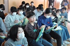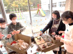 12月11日(木曜日)に、あおぞら学級で、さつまいものつるを使ったクリスマスリース作りをしました。子供たちは、グループごとにリボンや松ぼっくりなどの飾り付けを楽しく行いました。思い思いの素敵なリースが完成し、大満足の子供たちでした。