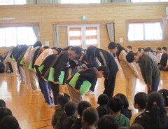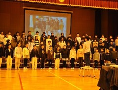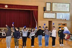 卒業を前に、6年生が心を込めてデザインした卒業記念品「バナー(のぼり旗)」の贈呈式が行われました。運動会をはじめとする様々な行事で、楯岡小学校の新たなシンボルとして輝いてほしいという6年生の熱い願いが、在校生へと力強く託されました。会場ではさらに、5年生から来年度の低学年が使用する新しい「青帽子」が披露され、4年生からは地域の方々の協力を得て完成した手縫いの「青玉」がお披露目されました。この青玉は4年3組の児童が自ら地域へ働きかけ、その想いに応えた方々が一つ一つ真心込めて仕上げてくださったものです。自分たちの学校を自分たちの手で、そして地域と共に創り上げていくという全校生の決意と、周囲への感謝が形になった、未来への希望あふれるお披露目となりました。