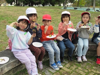 1年生が畑で収穫したさつまいを、やきいもにして食べました。