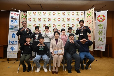 5年生が県庁を訪問し、吉村美栄子山形県知事に青ten米を届けてきました。